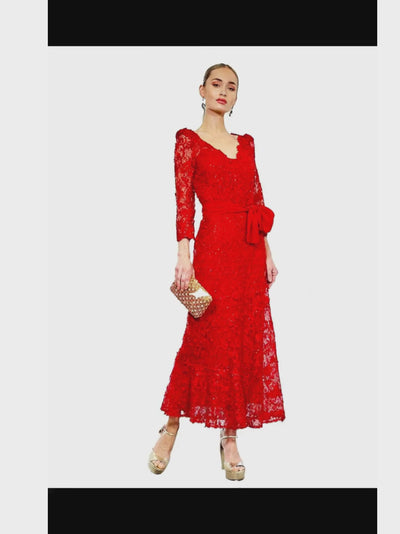 VESTIDO MIDI GRANA VOLANTES TUL GUIPUR