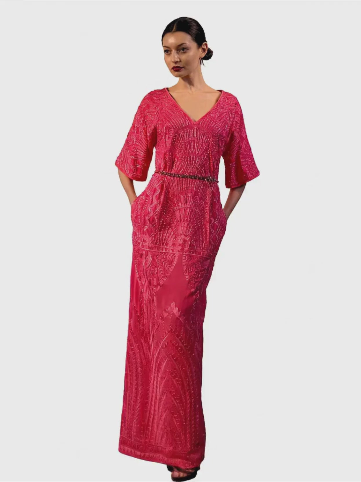 Vestido largo en doble gasa coral bordada a mano en hilo y cristal.